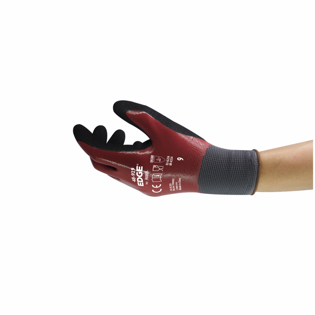 Guantes Ansell EDGE 48-919 combinan doble recubrimiento de nitrilo con palma texturizada para un agarre seguro en superficies aceitosas, protegiendo frente a abrasión sin perder flexibilidad.